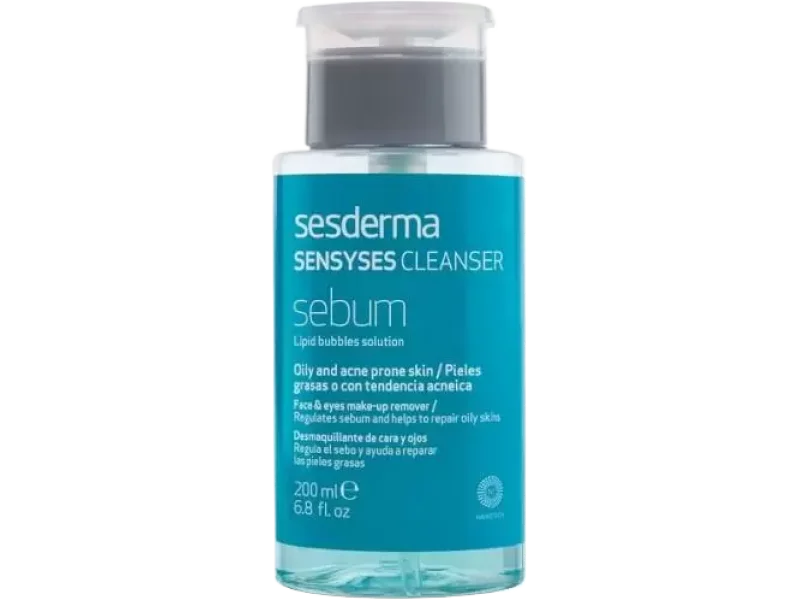 Sesderma Sensyses Cleanser Sebum to wielofunkcyjny płyn do oczyszczania twarzy, który w jednym preparacie łączy właściwości demakijażu, toniku oraz środka micelarnego. Dedykowany jest osobom z cerą tłustą, mieszaną, trądzikową oraz skłonną do łojotoku, które potrzebują skutecznego, ale jednocześnie delikatnego rozwiązania w codziennej pielęgnacji. Formuła oparta na zaawansowanej technologii liposomowej zapewnia głębokie oczyszczenie bez naruszania naturalnej równowagi hydrolipidowej skóry.