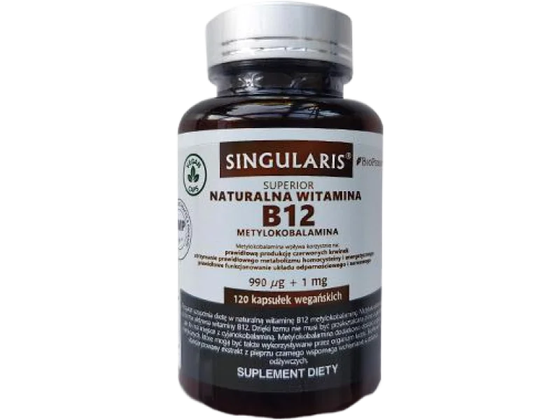 Suplement diety SINGULARIS Superior bazuje na naturalnej witaminie B12 w bioaktywnej postaci metylokobalaminy, uzupełnionej o opatentowany ekstrakt BioPerine, który wspomaga przyswajanie składników aktywnych. Pojedyncza kapsułka zawiera 990 μg metylokobalaminy, co odpowiada 39600% dziennego zapotrzebowania referencyjnego.